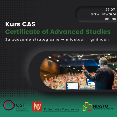 Zapraszamy do udziału w drzwiach otwartych, w formule online, Kursu CAS „Zarządzanie strategiczne w miastach i gminach”. Proponujemy dwa terminy – 27 lipca oraz 7 lub 8 września. Podczas drzwi otwartych przedstawiciele Fundacji Miasto, Politechniki Wrocławskiej oraz uczelni wyższej w St. Gallen w Szwajcarii – Eastern Switzerland University of Applied Sciences (OST) przybliżą formułę kursu a także krótko scharakteryzują zaplanowane moduły tematyczne z udziałem wykładowców. Będziecie to również możliwość zadawania pytań organizatorom kurs oraz wykładowcom.